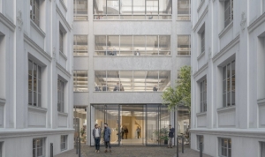 Ancienne concession automobile transformée en immeuble avec bureaux espaces extérieurs paysagés, cafétéria, salle de fitness et espace de logistique urbaine.