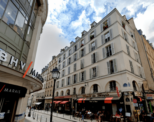 Immeuble de plus de 15 logements avec deux restaurants et un magasin d’articles de fêtes en pied d’immeuble en pied d'immeuble. Il est situé en face du BHV.