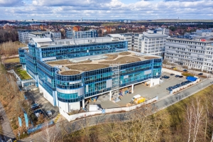Bâtiment équipé de toitures végétalisées et comprenant un local à vélos et affichant une bonne performance énergétique.