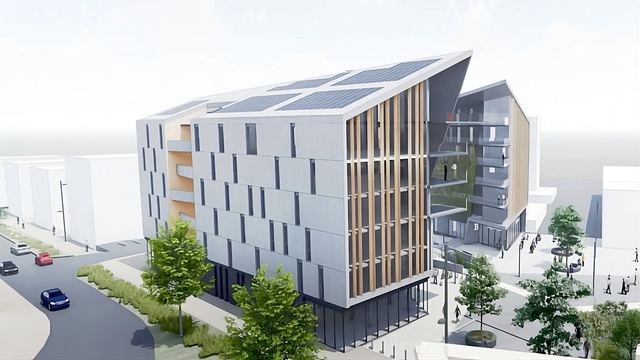 Bâtiment de 5 étages faisant partie du programme immobilier "Le Cinquième Elément". Il est situé dans le quartier Manufacture Plaine-Achille à Saint-Etienne.