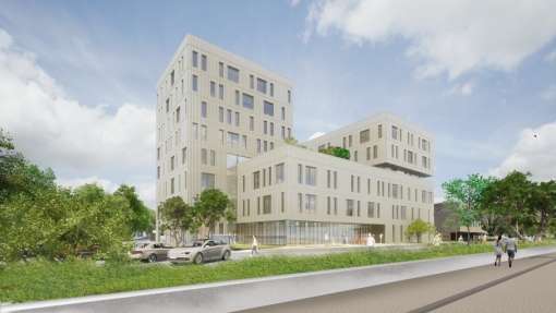 Immeuble de bureaux Pantone, situé au 2 Jean Moulin dans le quartier Chantenay à Nantes. L'immeuble est un bâtiment neuf de 5 650 m2 réparti en 2 plots (R+5 et R+7) sur un socle commun en R+2.