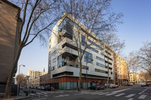 Immeuble de bureaux avec commerces au rez-de-chaussée.