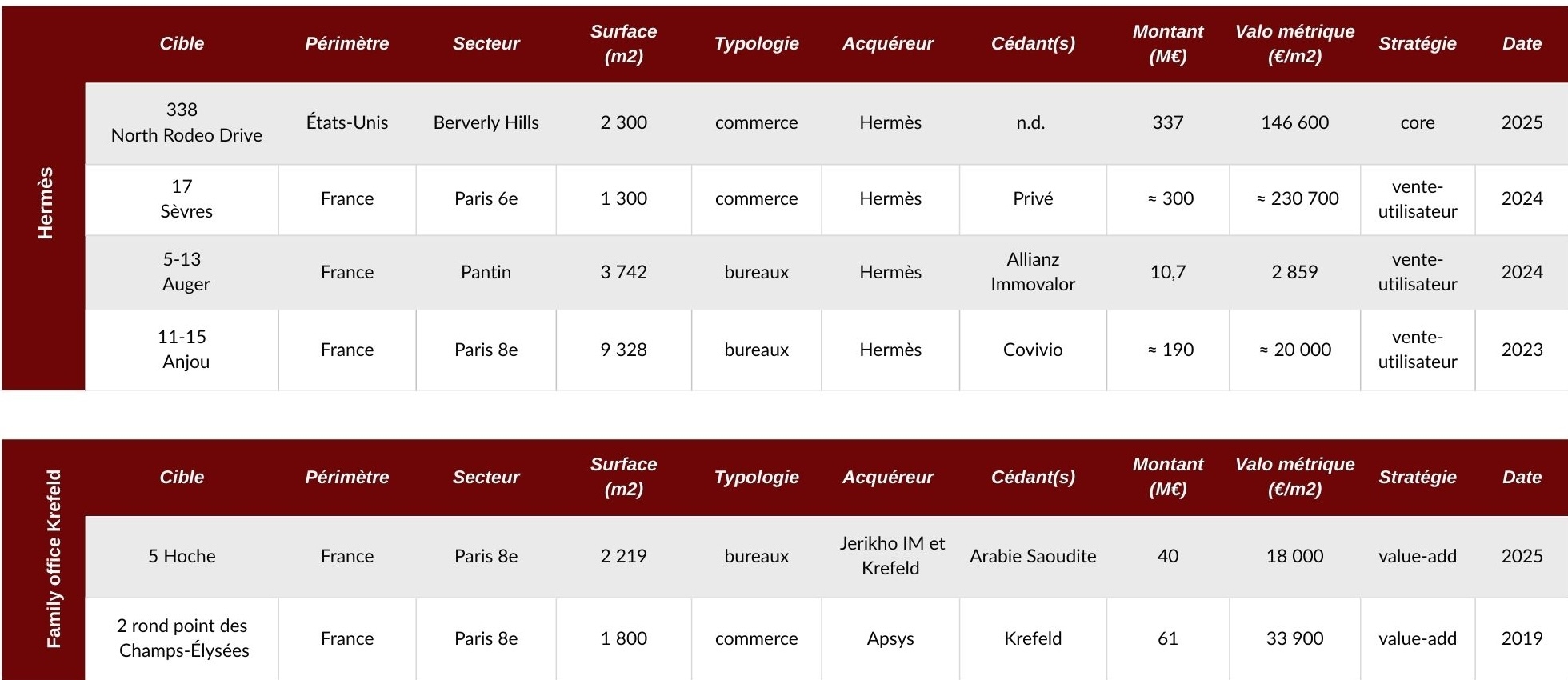 Hermès ne sécurise pas uniquement à l'invest ses implantations retail. En 2023, la maison de luxe – qui signait un befa au premier trimestre 2022 sur la base d’un loyer de 850-900 €/m2/an sur le 11-15 Anjou, dans le 8e arrondissement – a repris les clés de l’immeuble de 9 328 mètres carrés de bureaux en l’état à Covivio, pour près de 190 M€ off market et un yield proche de 3,4 %. Ensemble de style industriel des années 30, le 11/15 Anjou était initialement acquis par Covivio – alors Foncière des Régions – en 2006, dans le cadre de la vaste externalisation d’Orange – alors France Télécom. L’immeuble est resté occupé par l’opérateur mobile, ainsi que par La Poste, jusqu’à fin 2021. Un projet de restructuration est alors lancé avec Studios Architecture, afin de créer un opus prime.