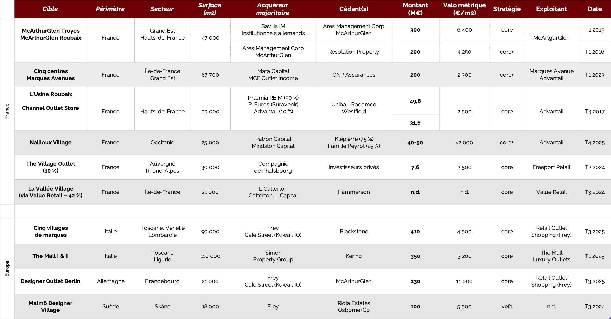 Les transactions sur des centres outlets en France, et en Europe par des français (2015-2025)
